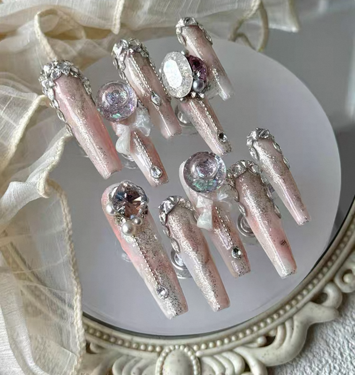 Charme Atelier - Blush Pink with Glitter and Rhinestones - Customizable Handcrafted Press On Nails
