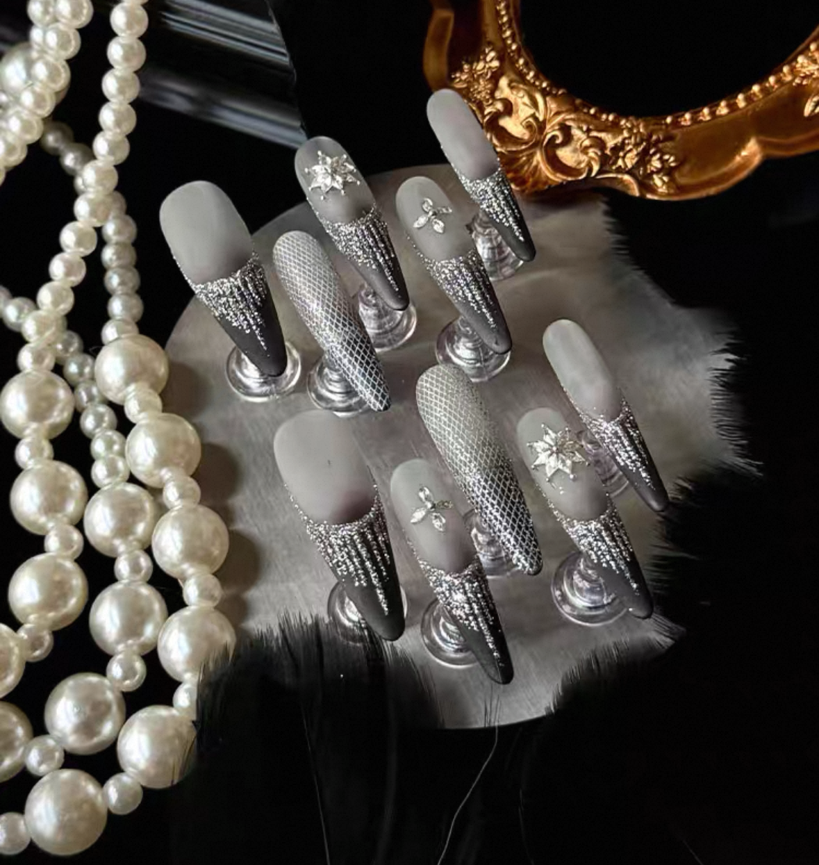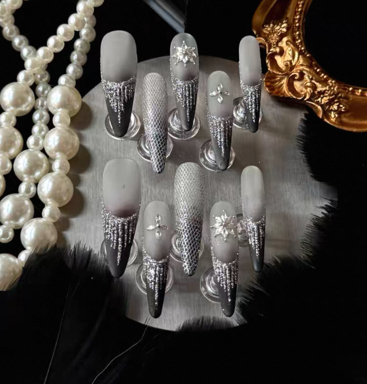 Charme Atelier - Elegant Black & Silver - Customizable Handcrafted Press On Nails
