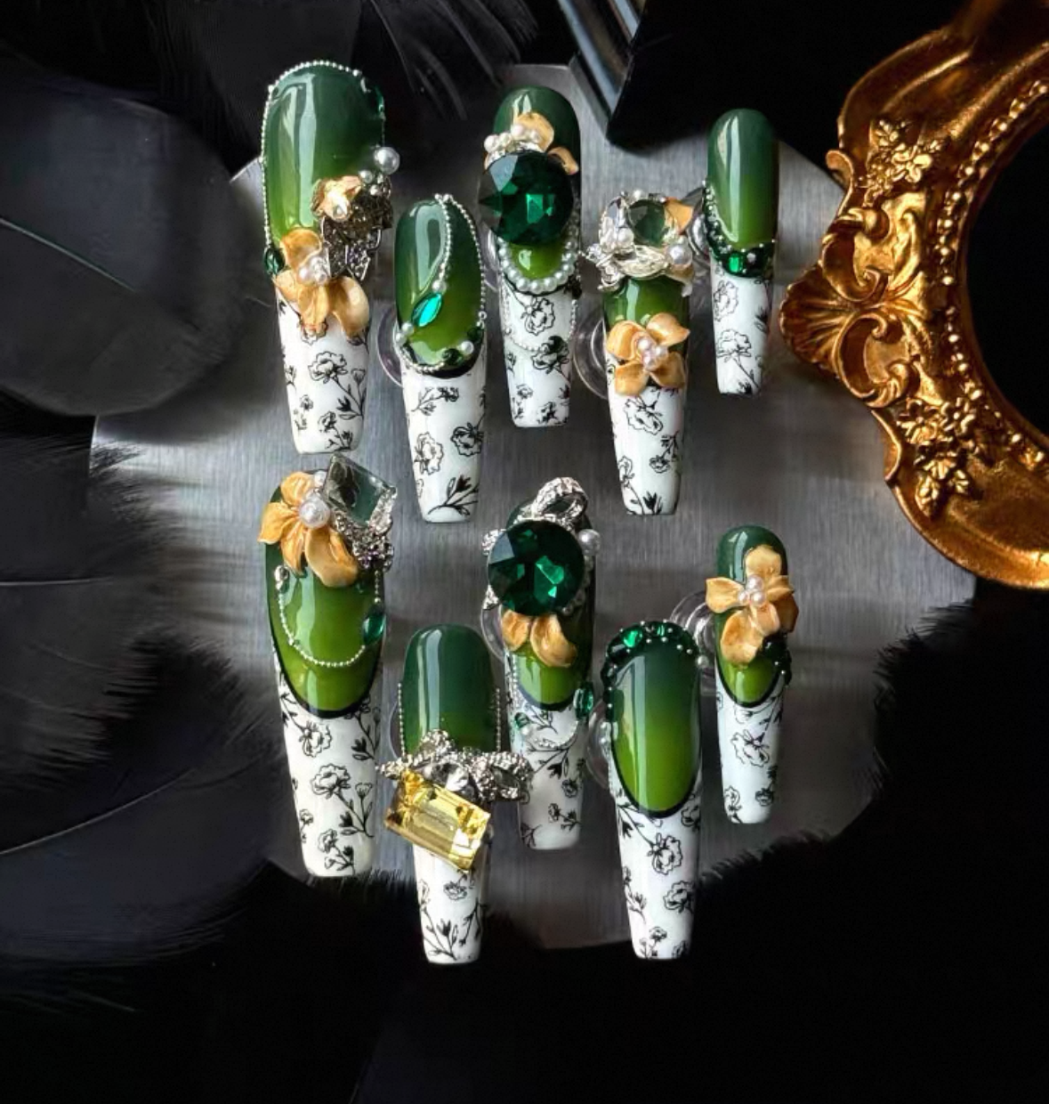 Charme Atelier - Green and Floral - Customizable Handcrafted Press On Nails